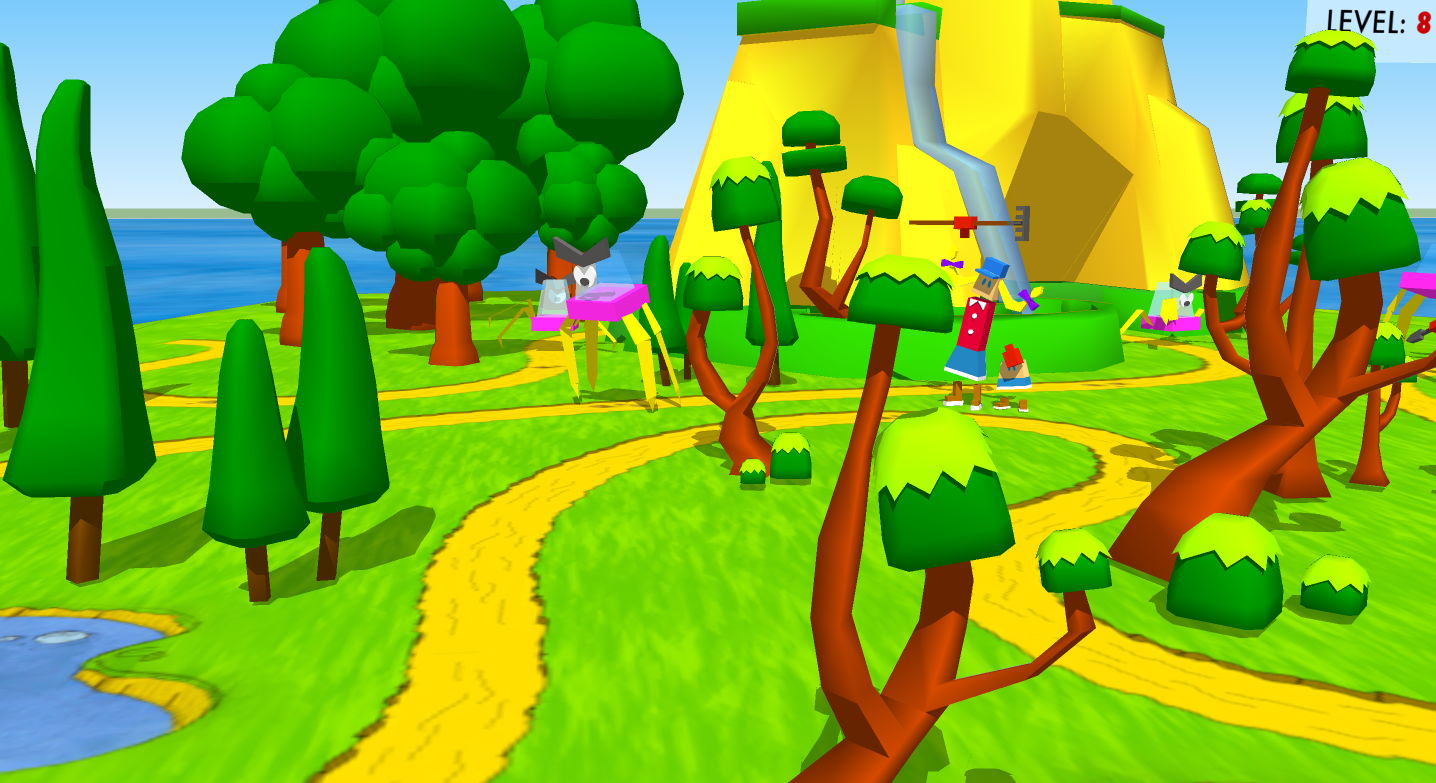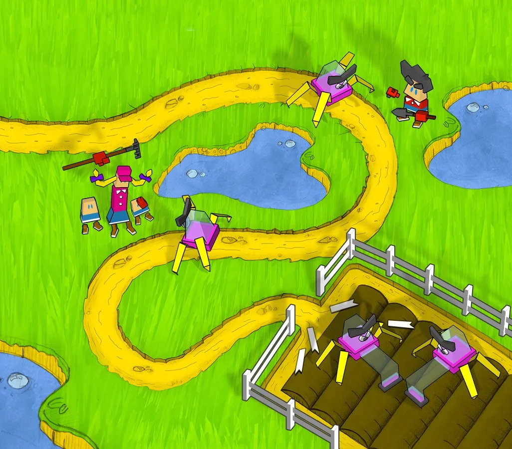 An iOS tower defense game pitting farmers against vegetable stealing aliens from another world. 2D sketches were translated into 3D, using 2D sprites with false depth for efficient texturing.